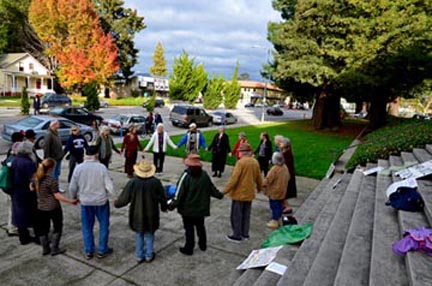 Community members gathered at the courthouse during the evenings and either slept or protested there to make a strong statement against the criminalization of homelessness locally. The action quickly grew and began to include a large number of homeless community members looking for a safe place to be at night.