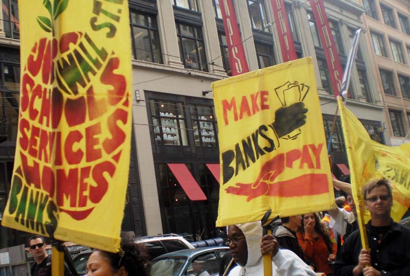 Meetings break into working groups, trainings or committees. In the daytime, the demonstrators do public outreach at the Federal Reserve Building, while others walk the Embarcadero with signs. Night camp beds down two blocks away at Steuart and Embarcadero.