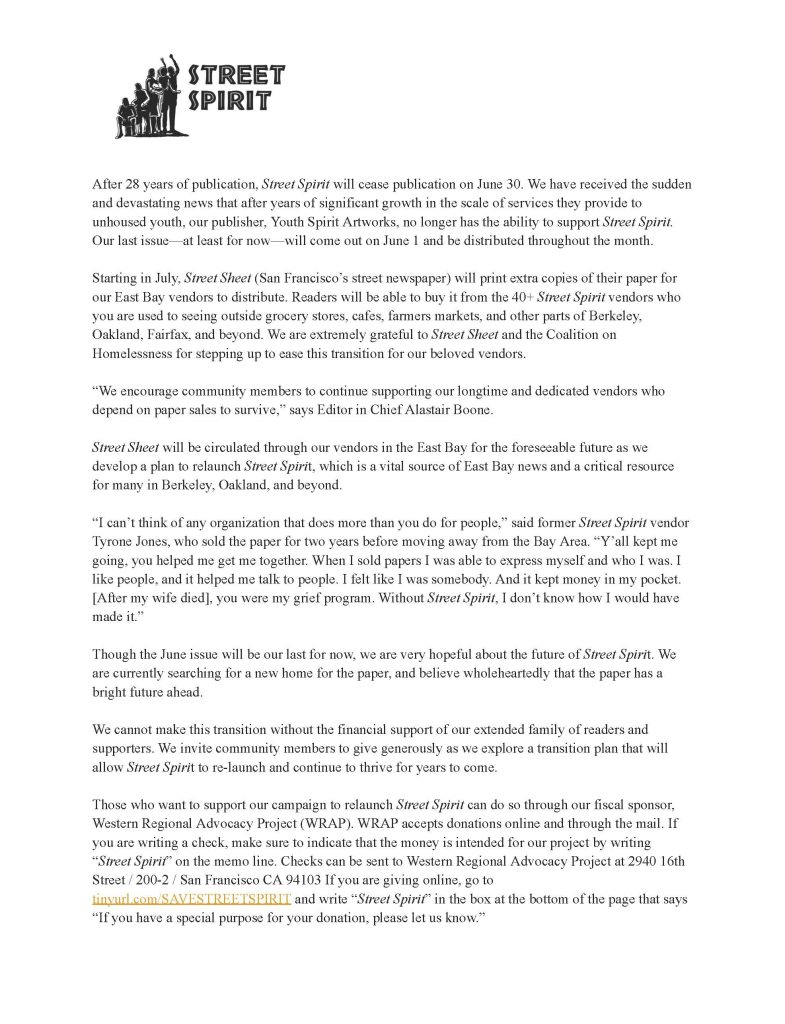 Checks can made payable to “Independent Arts and Media.” Just make sure to write “Street Spirit” on the memo line!
