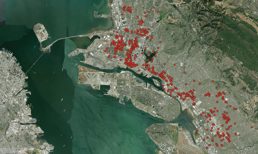 The dataset utilized in this article contains 1899 records. This is the most recent data made available by the City of Oakland, containing encampment postings from January 2021 to July 2025. After cleaning and geocoding the location descriptions inputted by the city, we identified only 498 unique locations, which are displayed above. It’s important to note that these dots represent unique posting locations, not necessarily sweep events or even encampment locations. Many of these locations have been swept many times by the City of Oakland. Occasionally, multiple posting locations refer to the same large encampment or same large abatement action, even if they are listed as separate locations. (Cole Haddock and Maria Toldi)