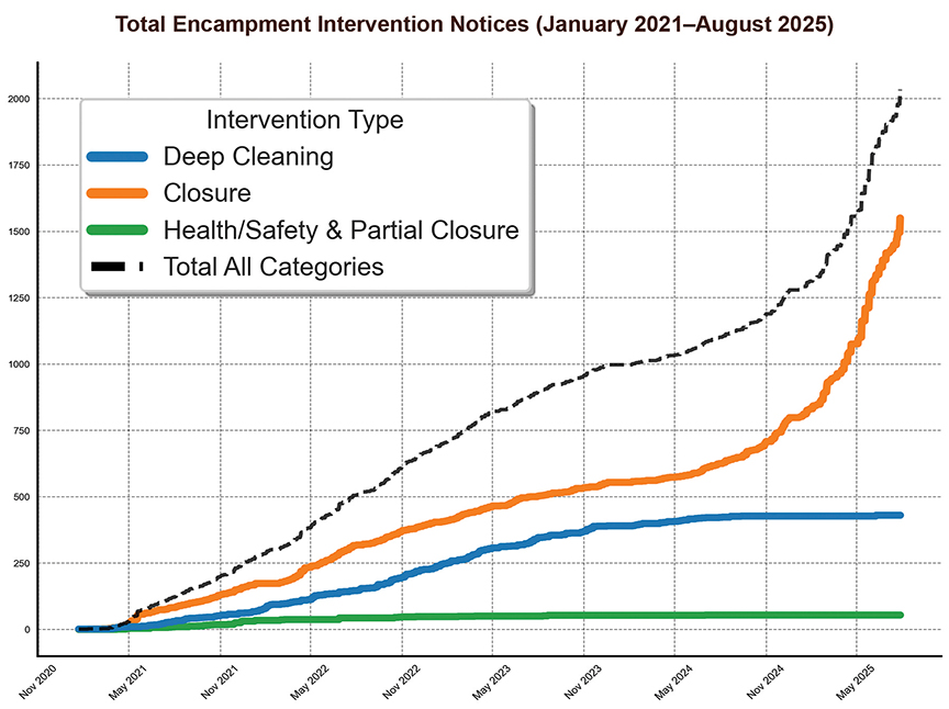 Number of Notices Linked to Major Encampments (Jan 2021–Aug 2025)