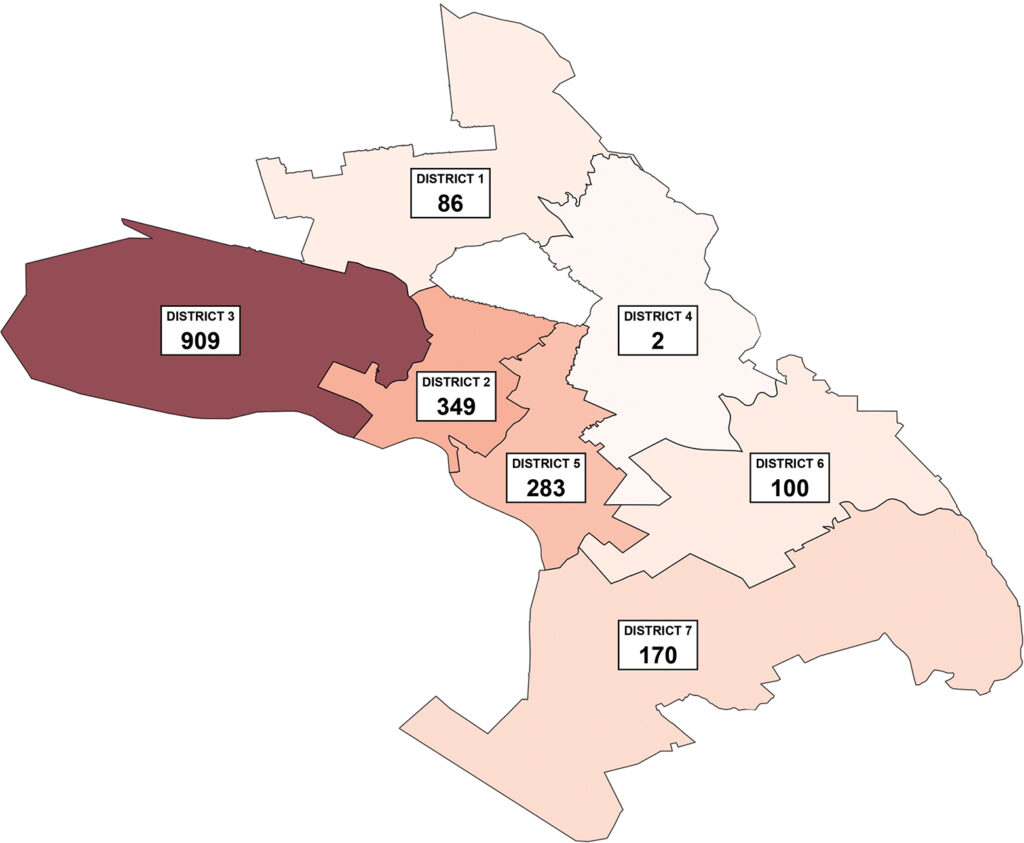 The district also contains the majority of the city’s encampments. Using encampment service requests from Oakland’s 311 reporting system between 2021 and 2023, city staff generated an estimate of the number of encampments by council district: District 3 has 29 percent of the city’s encampments; District 2 has 23 percent; District 7 has 15 percent; District 5 has 15 percent; District 1 has 12 percent; District 6 has 11 percent; and District 4 has 5 percent.