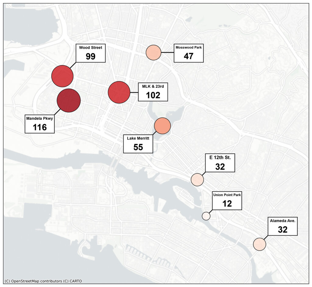 Take Lake Merritt, for example. Visible to commuters, surrounded by parks and businesses, and central to Oakland’s civic life, Lake Merritt has been a target of at least 55 encampment closures over the studied period.