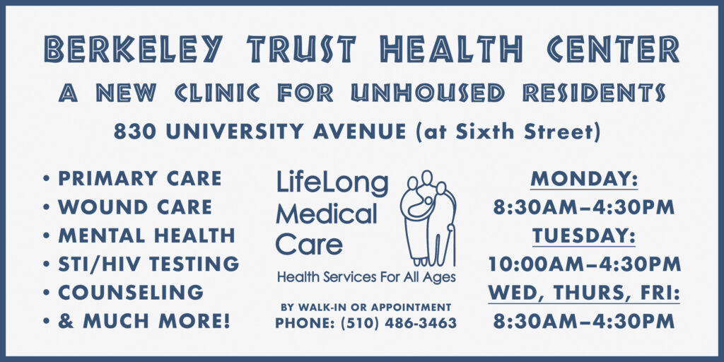 Lifelong’s Berkeley Health Trust Center will be open for appointments and walk-ins during open hours. Pets are allowed inside. The center offers primary care, mental health care, wound care, STI and HIV testing, recovery support, harm reduction supplies, and basic needs like food, water, coffee, and other medical supplies. The center also can help in enrolling in Medi-Cal and SNAP.