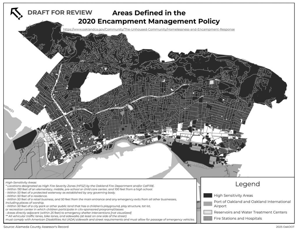 A map attached to Houston’s proposal does, in fact, label almost all of Oakland—save for small areas of the East Oakland and West Oakland flats—“high-sensitivity,” or subject to more aggressive closures of camps.